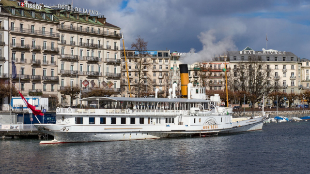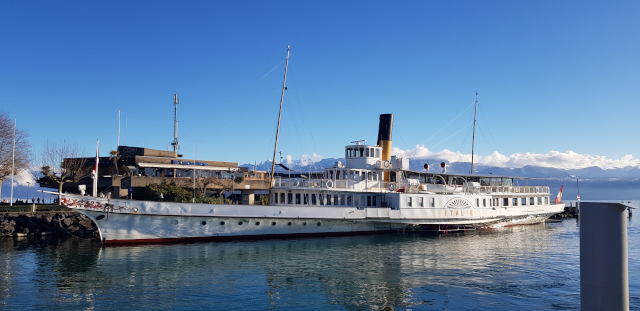 PS Montreux (Lake Geneva) ![]() photo: Jean Vernet As a result of the decision not to operate the Friday evening Fondue Cruises (due to the lack of a 'caterer') the two short afternoon cruises allocated to the paddle steamer have been increased to four for the reat of the winter timetable as comnpensation PS Montreux is seen at Geneva Mont Blanc pier prior to operating the new lunchtime 1320 sailing 734 to Bellevue | ||