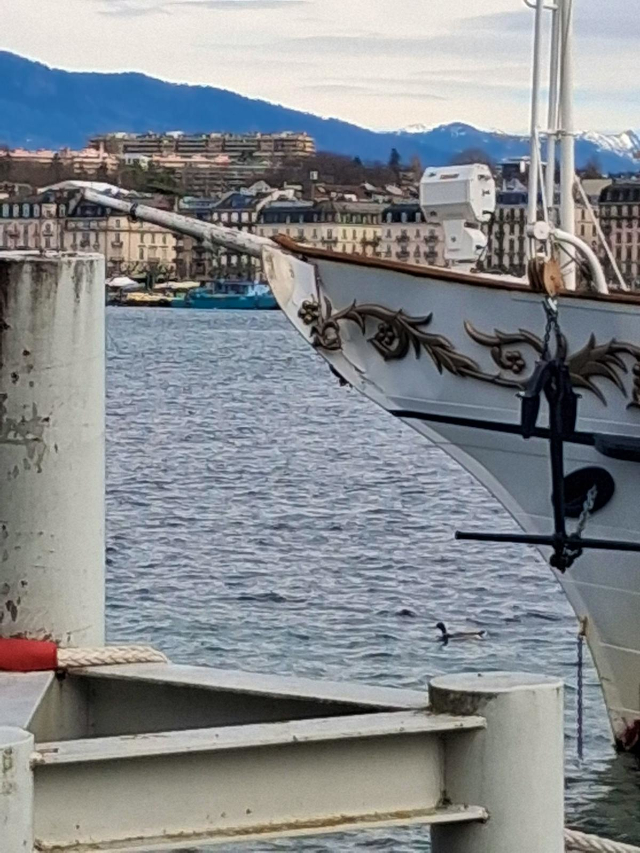 PS Montreux (Lake Geneva) ![]() photo: Jean Vernet The paddle steamer stands at Geneva at the end of sailing 734 The damage to her bow due to her overshooting Mont Blanc piercan be clearly seen She remains out of service pending an investigation into what went wrong | ||