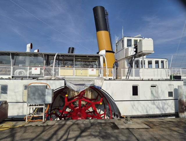 MPV Vevey (Lake Geneva) ![]() photo: Alain Vuistiner The motor paddle vessel stands at Ouchy dock proudly showing one of her recently istalled new paddle wheels as as part of her major oveerhaul She is exprcted to be ready to return to service mid-summer to enble her sister MPV Italie to also have new wheels fitted as part of her much delayed overhaul | ||