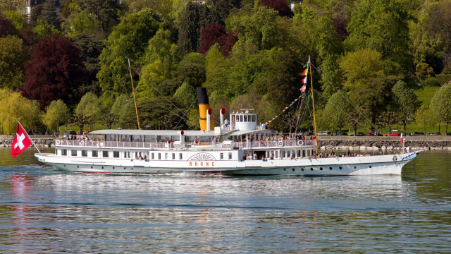 PS Rhône (Lake Geneva) ![]() photo: Jean Vernet The paddle steamer sers off from Ouchy harbour on a test run into the lake She is planned to enter service on Saturday 18th April and operate five short sailings from Ouchy harbour in connection with the CGN "Open Day" | ||