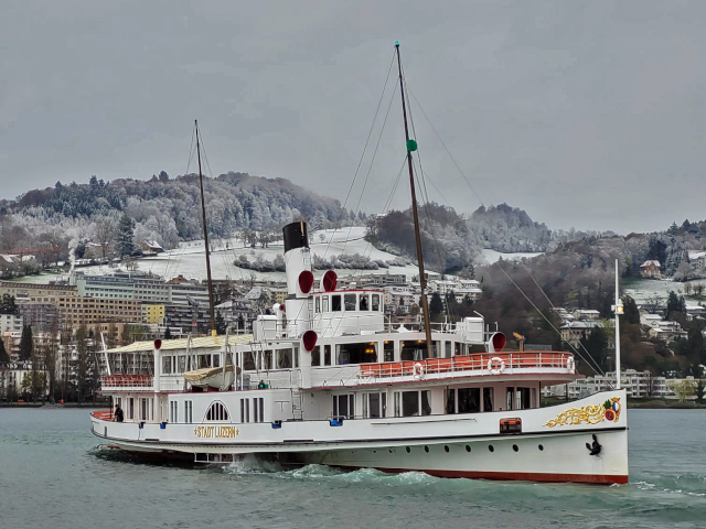 PS Stadt Luzern (Lake Luzern) ![]() photo: Sandro Cattaneo The paddle steamer sets of from the works for a pre-season "test" sailing She is planned to commence public sailings on Saturday 18th Apri | ||