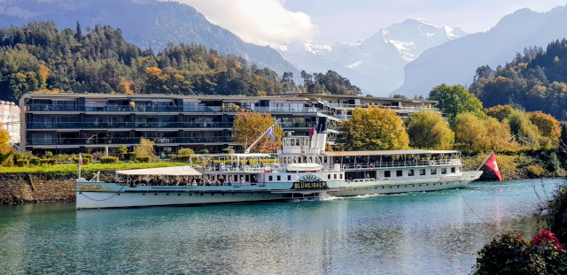 PS Blümlisalp (Lake Thun) ![]() photo: Alain Vuistiner The paddle steamer approaches Interlaken at the end of her daily full-length sailing 15 from Thun | ||