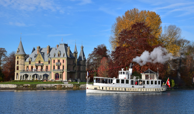 SS Spiez (Lake Thun) ![]() photo: Ernst Mischler The steamship passes Schadau Castle on her first of three short special sailing from Thun | ||