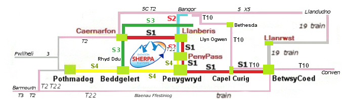 Later non-Sherpa Sunday journeys from...... Pen-y-Pass area to Llandudno/Conwy Valley Porthmadog area to Llandudno/Conwy Valley Beddgelert area to Llanberis Porthmadog area to Llanberis Llanberis area to Porthmadog area | |